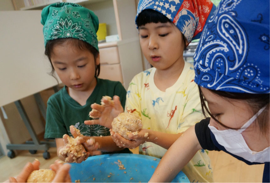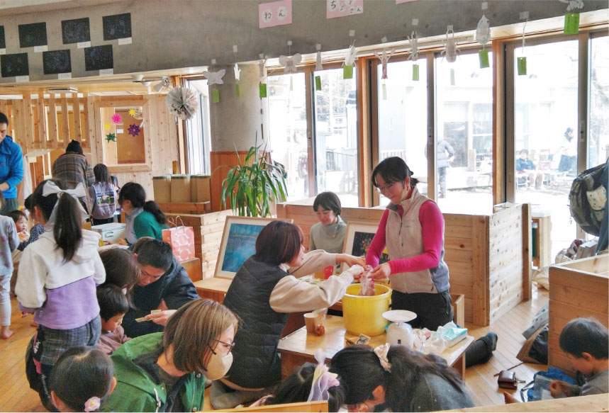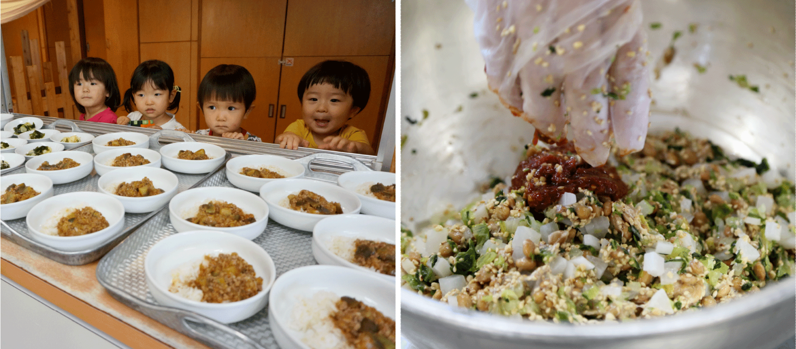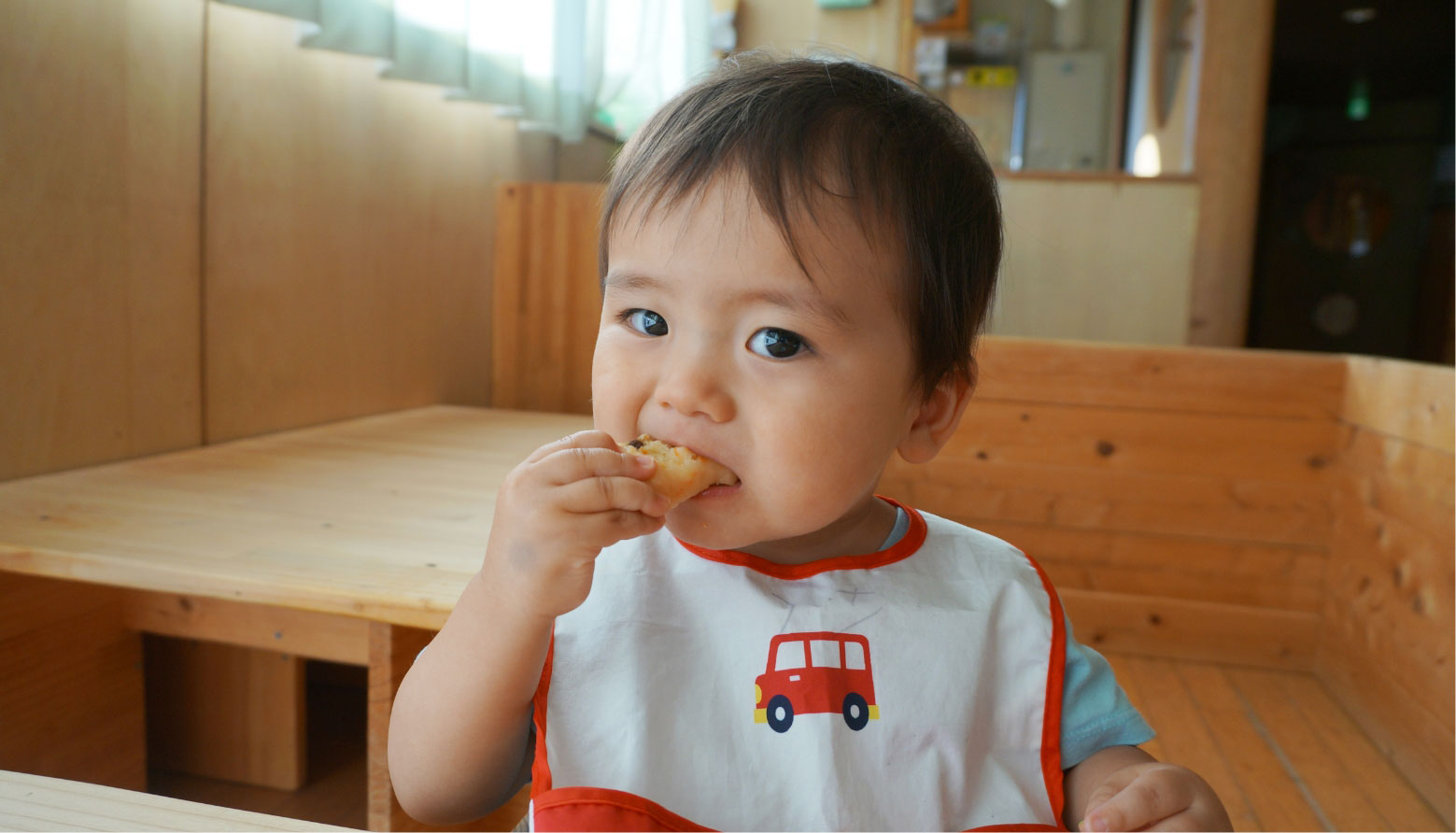 山形県産五分づき米を主にみそ汁、和え物、煮物の四季を感じる日本らしい食を手づくりしています。ご飯に願いをのせ、一緒に食卓を囲み、おいしいねを大切に食育に取り組んでいます。