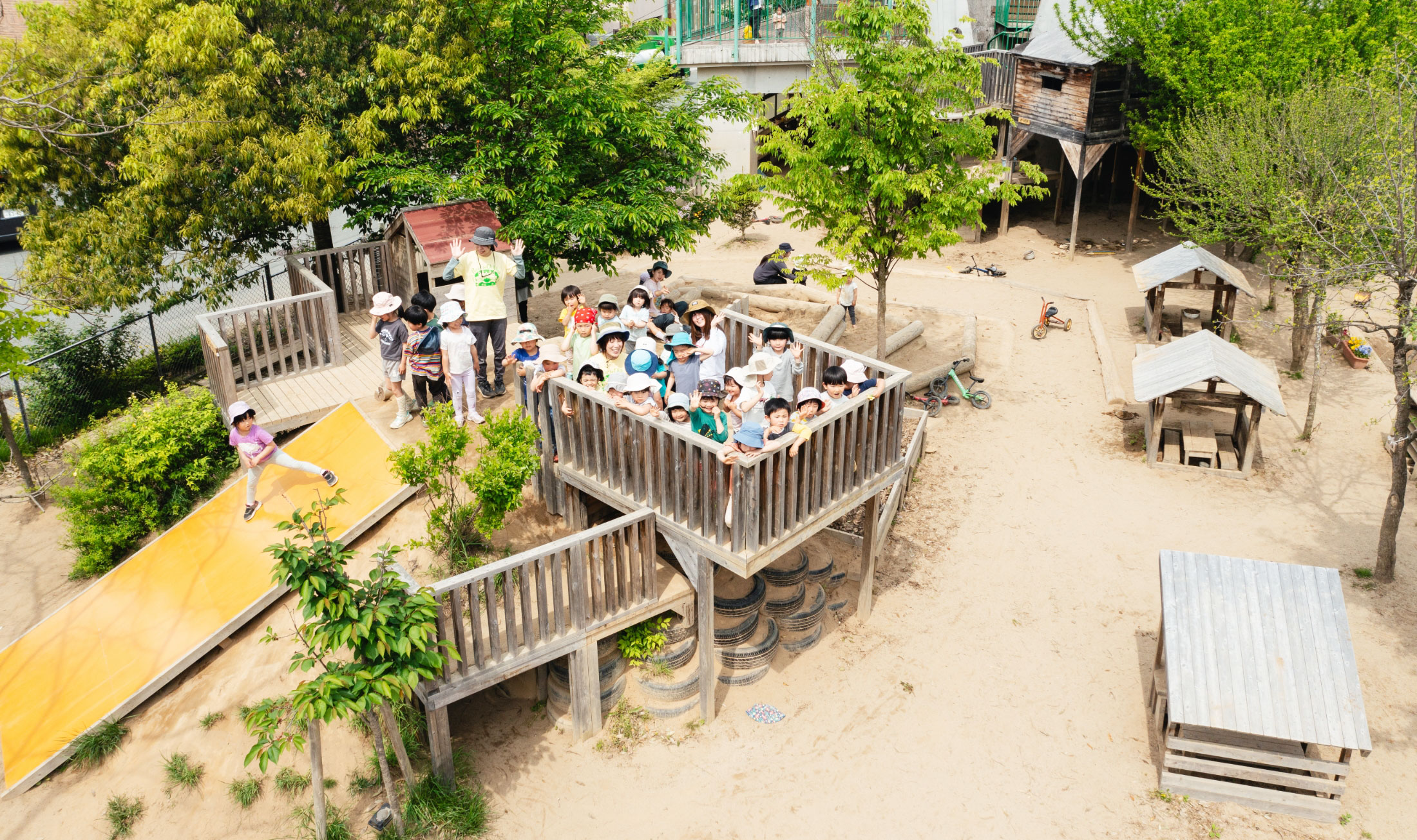 0歳から5歳のこどもたちが遊べる広い園庭。いつでもやってみたいが叶い、またやろうと続きを楽しみに遊べる場所です。