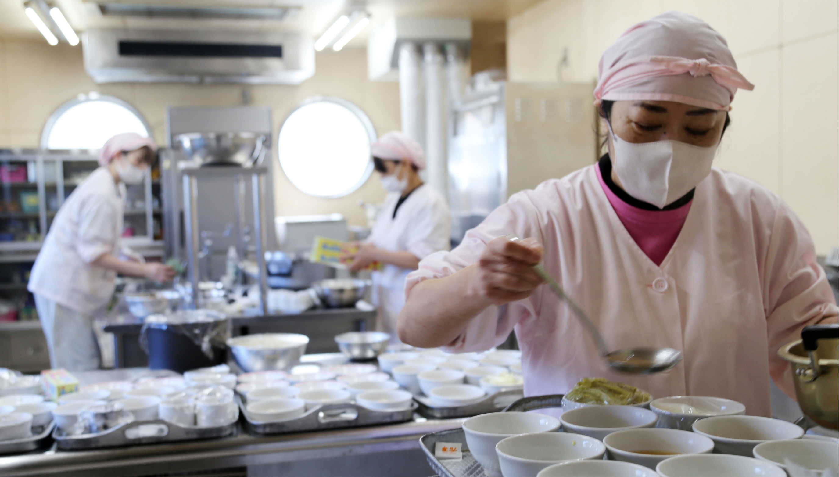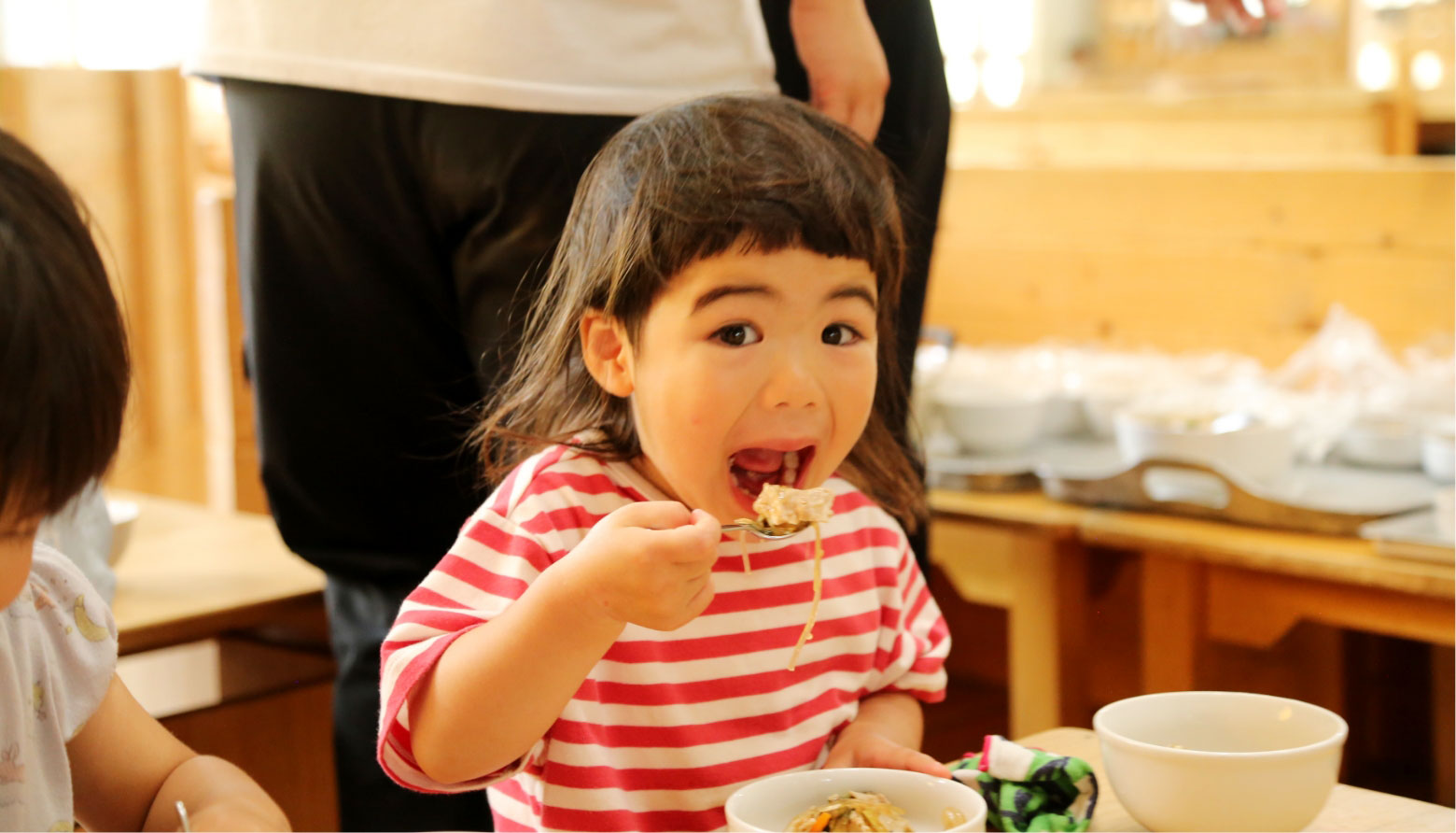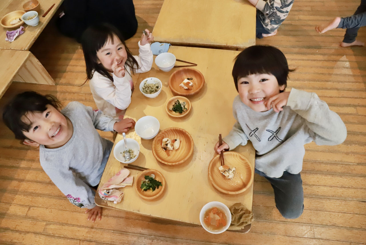 山形県産五分づき米を主にみそ汁、和え物、煮物の四季を感じる日本らしい食を手づくりしています。ご飯に願いをのせ、一緒に食卓を囲み、おいしいねを大切に食育に取り組んでいます。